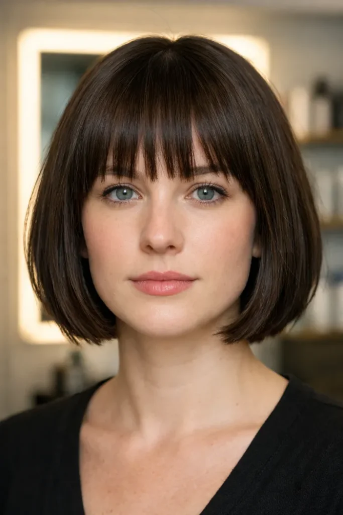 This chin-length bob has a rounded shape that keeps the sides full while the straight brow-grazing bangs bring more focus to the center of the face. On an oval face, that balance feels clean, neat, and easy to wear without looking too heavy.