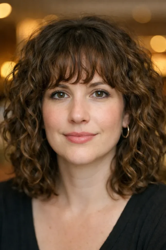 Ask for a collarbone-to-shoulder curly lob with light curly bangs and soft layers throughout. Have the fringe cut dry so the curls sit naturally and do not bounce up too short.