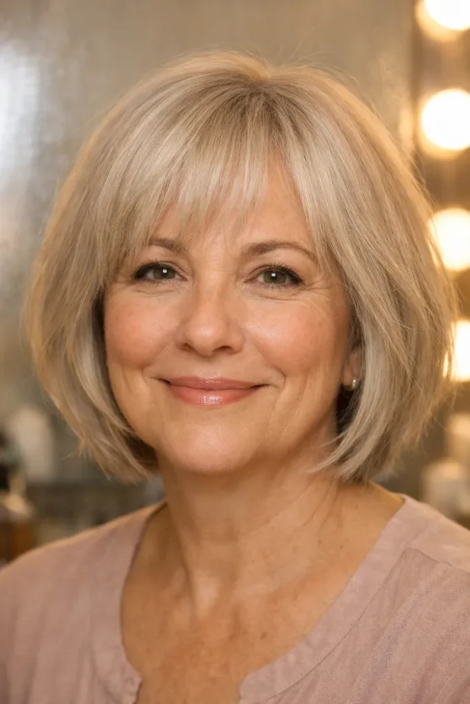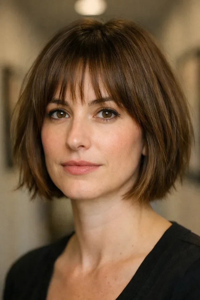 Ask for a jaw-length bob with light texture through the ends and a wispy bang that brushes the brows. Keep the fringe soft and slightly uneven so it does not look too blunt.