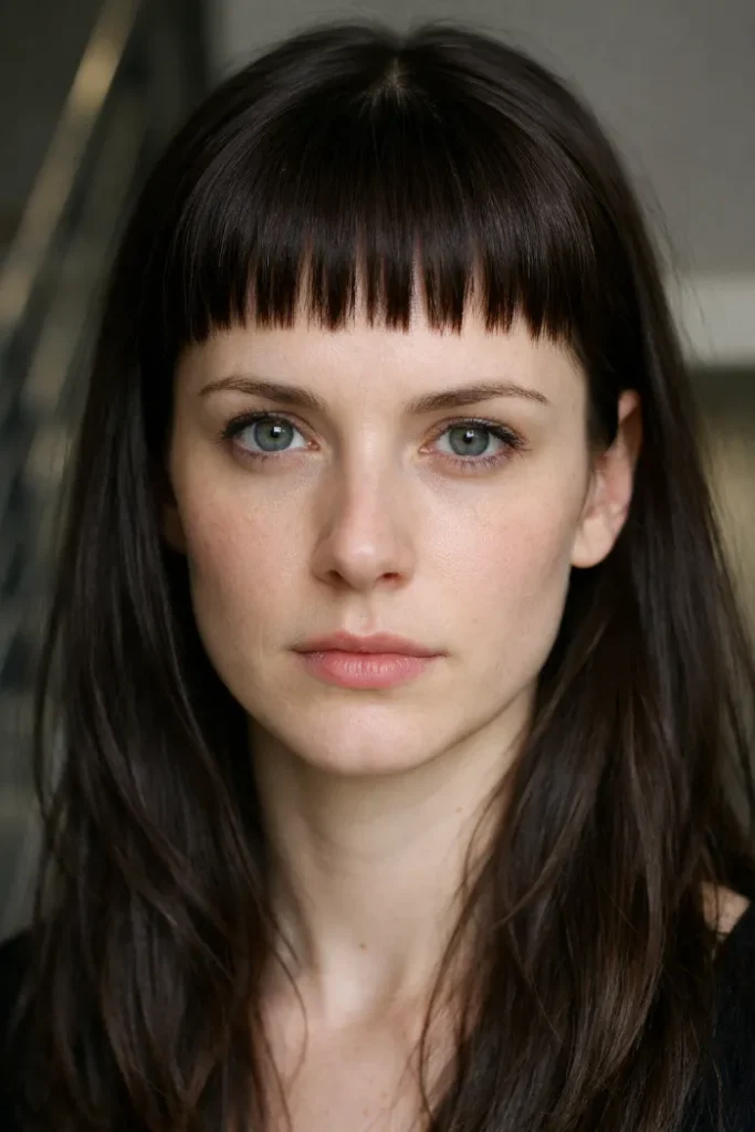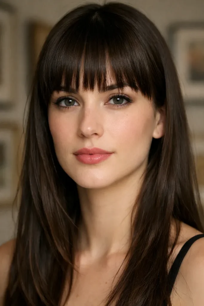 Ask for long straight hair with full blunt bangs cut just at or slightly below the brows. Keep the ends clean and the fringe smooth so the shape looks crisp.