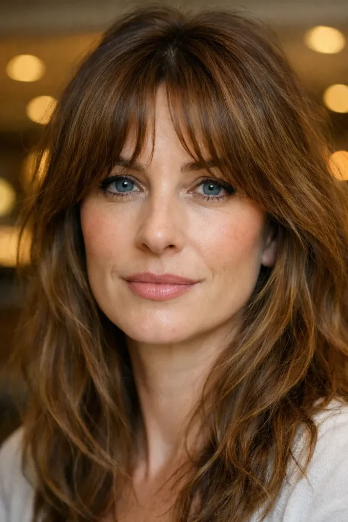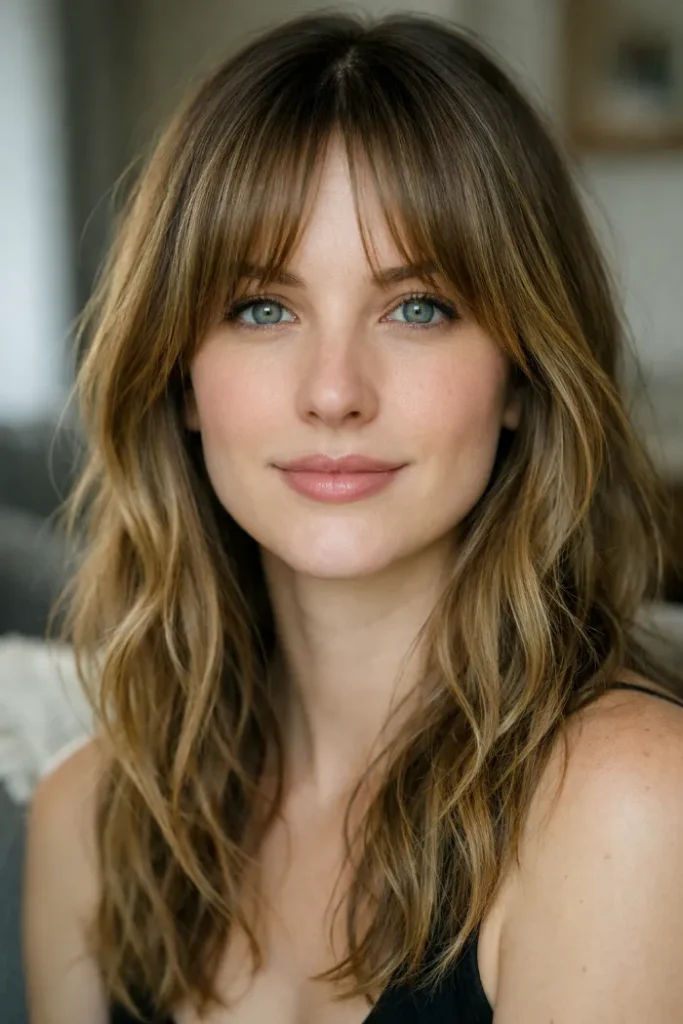 Ask for long hair with very light, airy bangs that skim the forehead without looking dense. Keep a few longer pieces at the sides so the fringe blends into the rest.