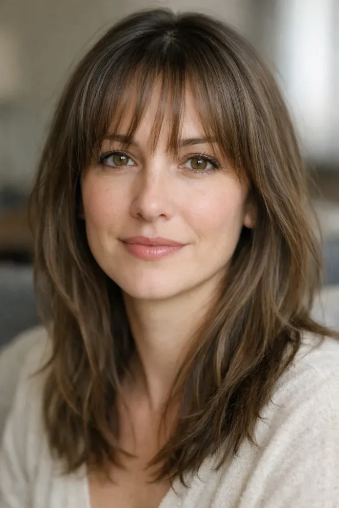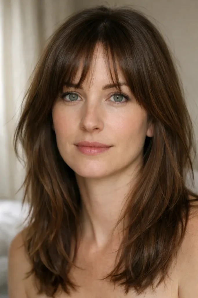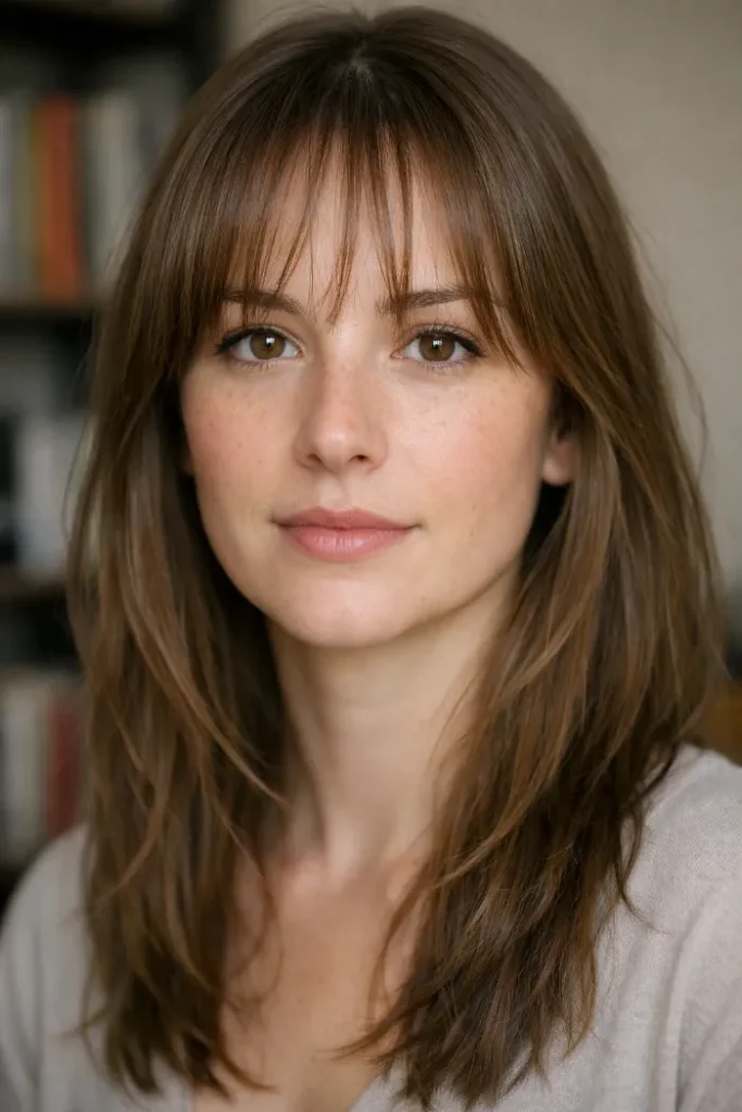 This long cut feels soft and easy because the bangs are broken up instead of cut thick and solid. The wispy finish suits an oval face well since it gives a little shape around the eyes while keeping the overall look open and relaxed.