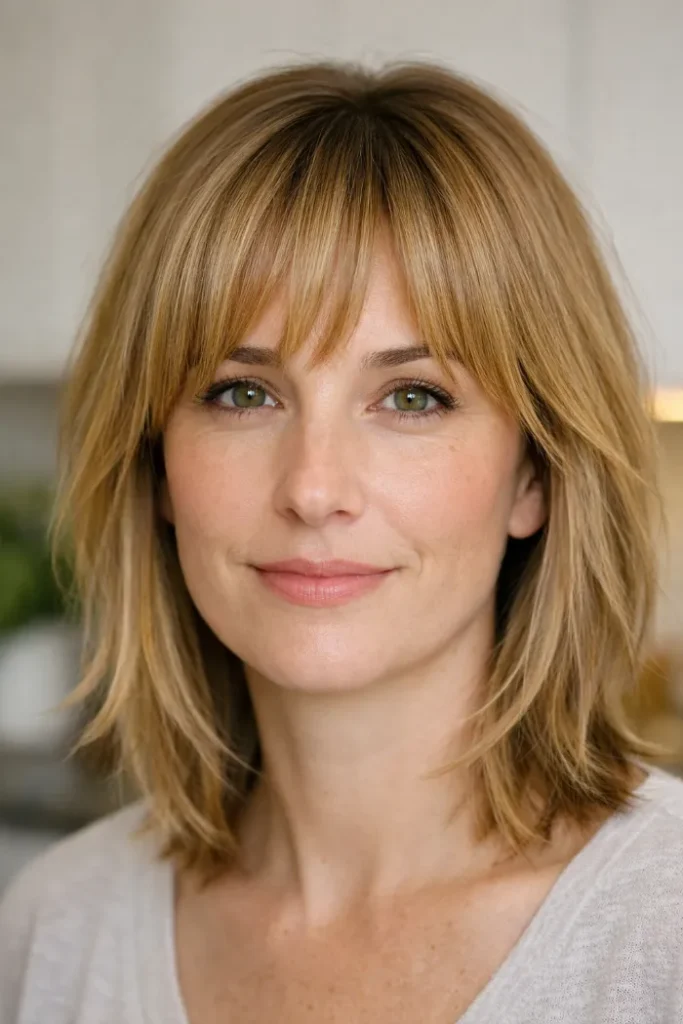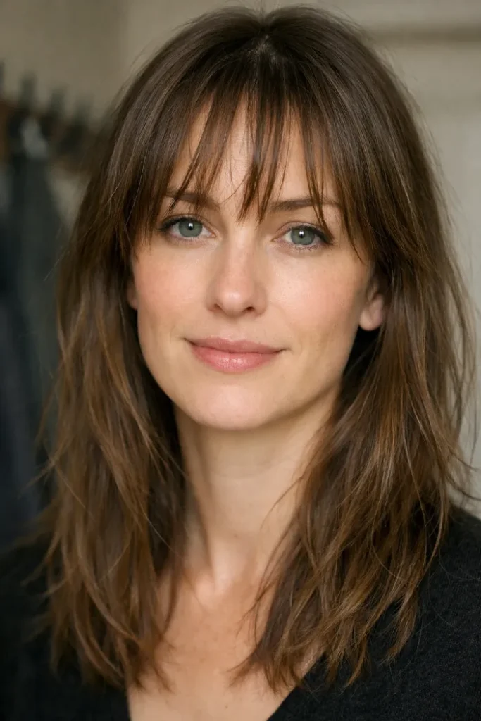 Ask for a medium-length cut with softly arched bangs that dip a little lower in the center. Keep the ends lightly textured so the cut does not feel too stiff.