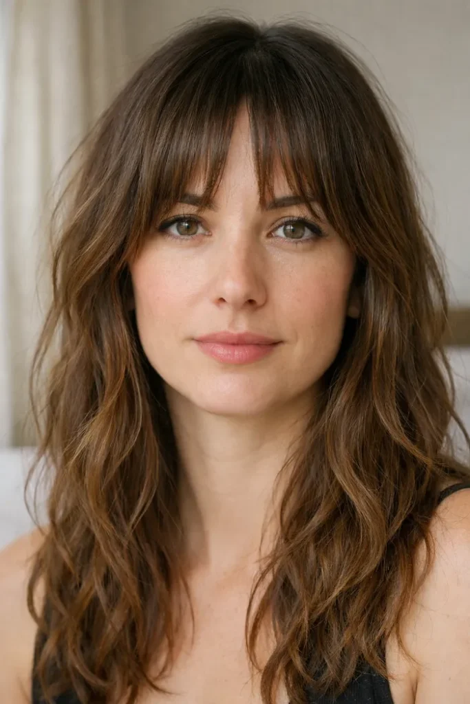Ask for long wavy layers with bottleneck bangs that start slimmer in the center and get longer toward the cheekbones. Let the front stay airy rather than thick.