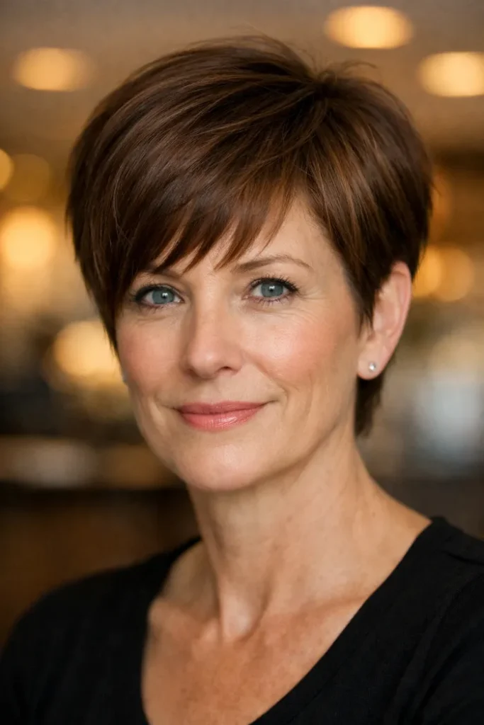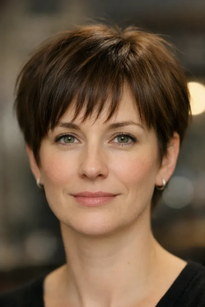 Ask for a short pixie with longer bangs sweeping across the forehead and into the side. Keep some texture at the crown so the cut feels soft, not flat.