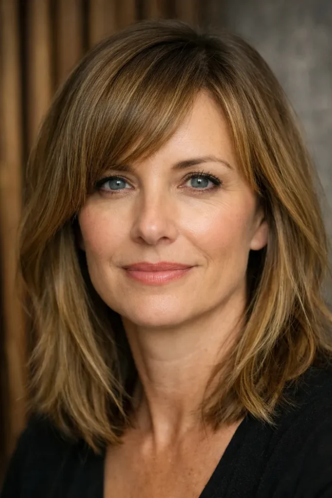 This shoulder-length lob feels simple, but the side-swept bangs make it more polished and flattering. On an oval face, that diagonal line breaks up the front nicely and adds movement without needing a lot of layers or extra styling.