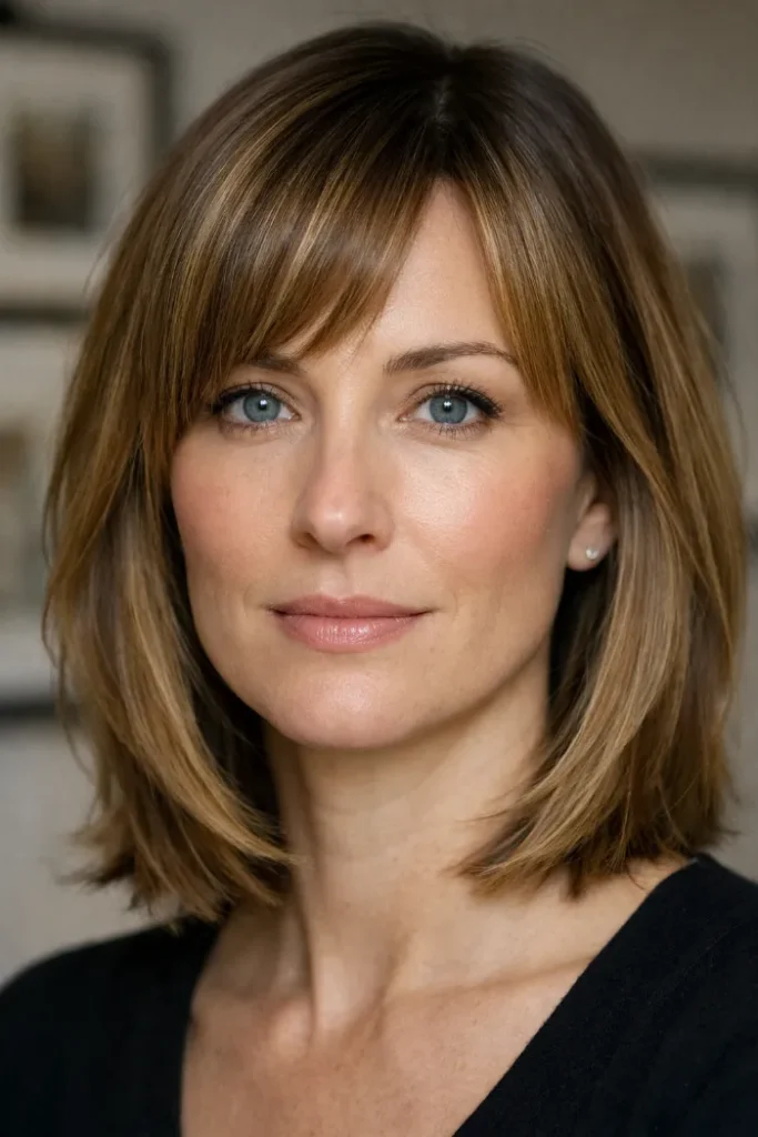 Ask for a shoulder-length lob with long side-swept bangs that blend into the front sections. Keep the ends clean with only light texture so the shape still looks full.