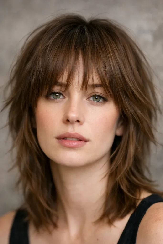 Ask for a soft shag with feathered bangs and layered movement around the face. Use a light styling cream or spray to keep the texture soft instead of crunchy.