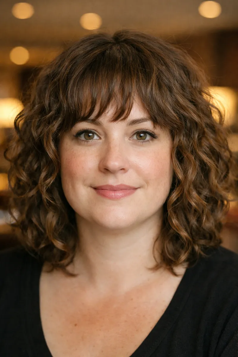 Ask for a collarbone-grazing curly lob with layered shaping and light curly bangs. Keep the fringe soft and separated, not thick. Use a curl cream and diffuse gently so the curls stay defined without getting too puffy at the crown.