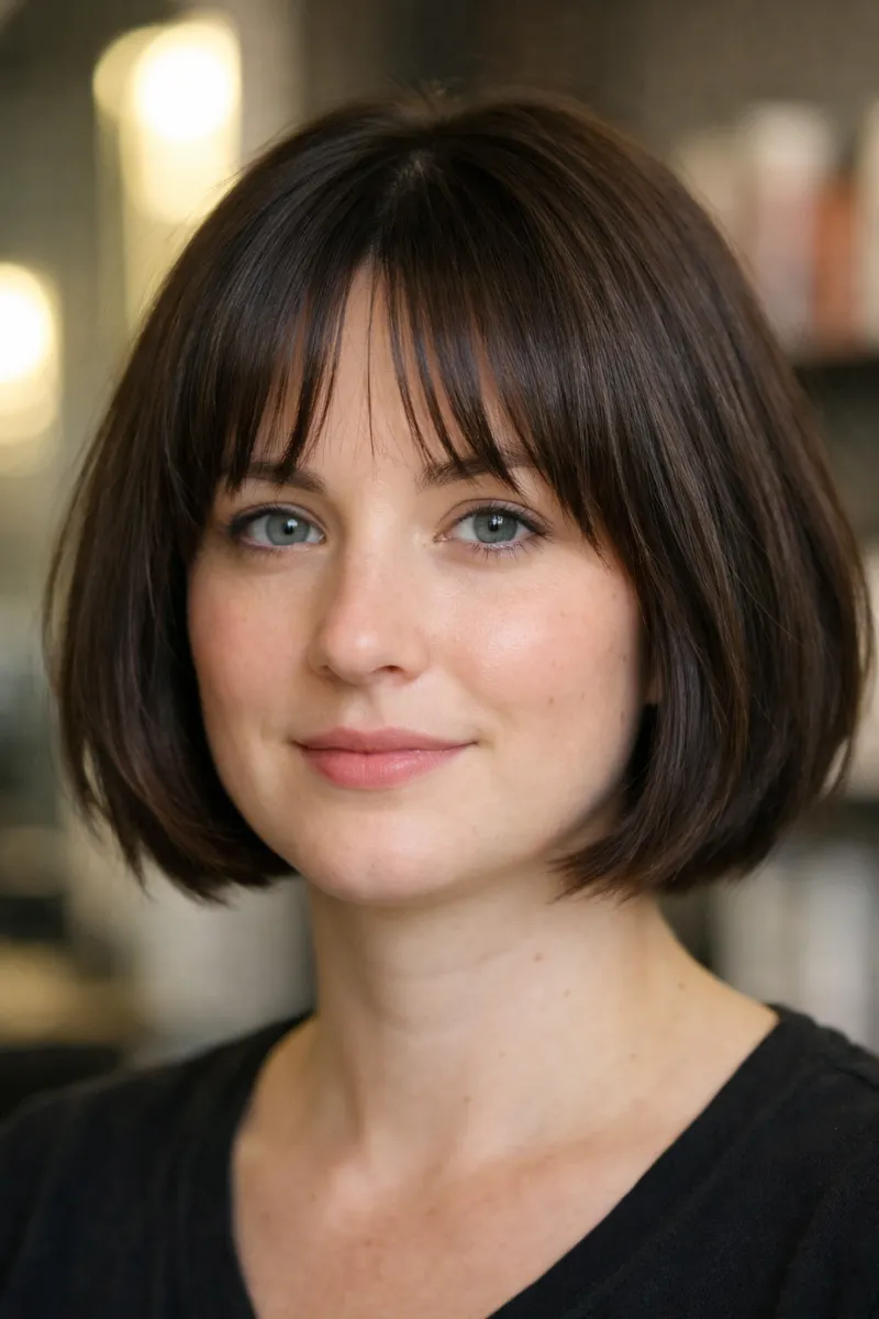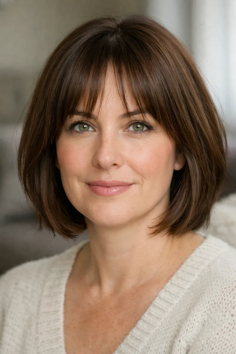 This jaw-length bob has a smooth, rounded line that feels clean without looking stiff. The curtain fringe parts gently and softens the upper face, which helps the whole cut feel more open. It is a good option if you like polished shapes with a little softness.