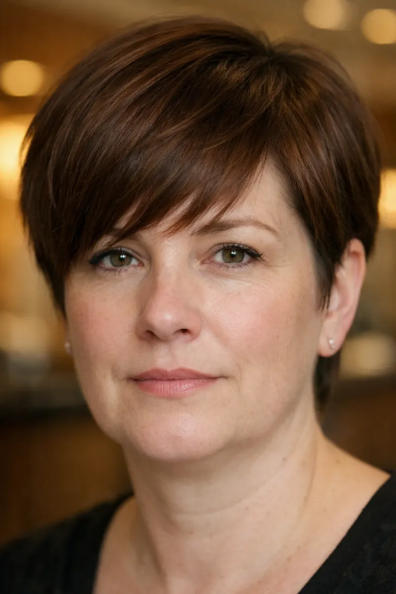 The long sweeping bangs are the key detail here because they pull the eye across the face instead of straight across it. That makes the pixie feel softer and more balanced. This is a great short option if you want shape without harsh edges.