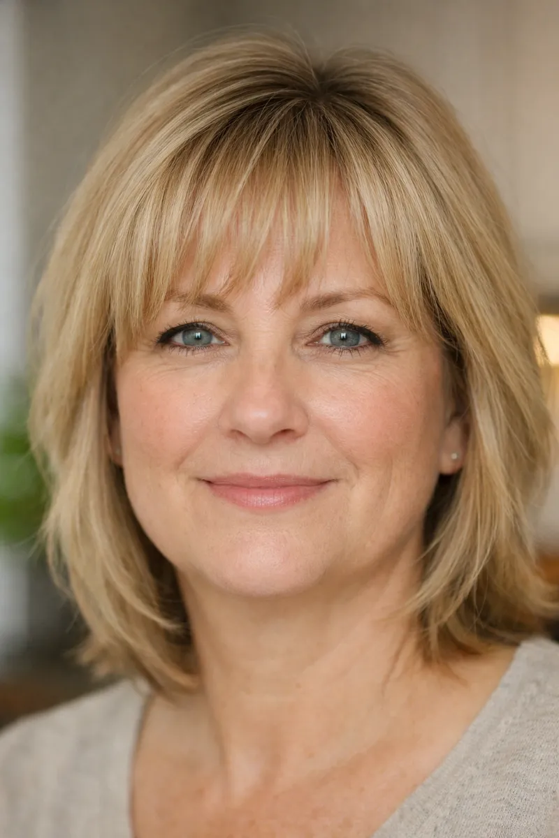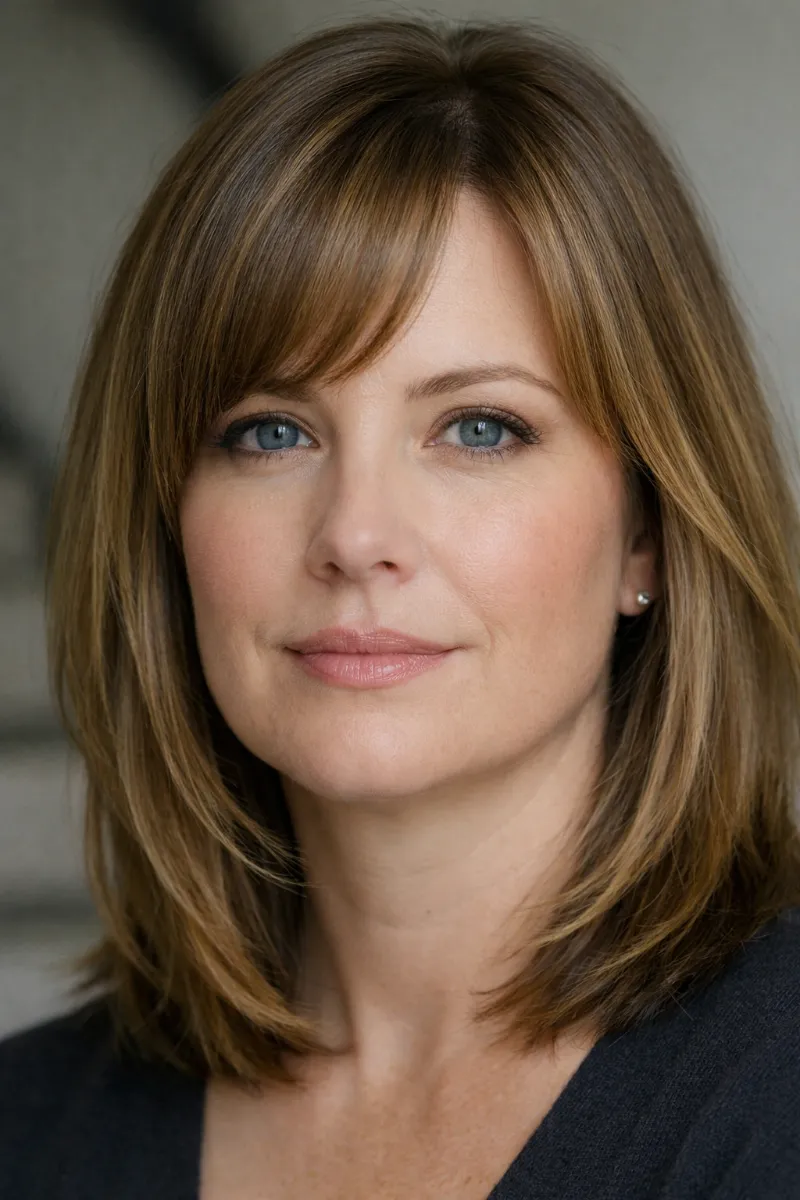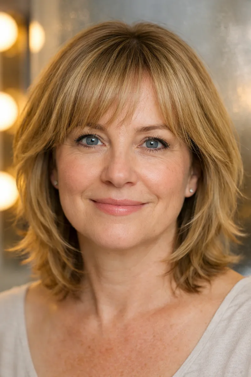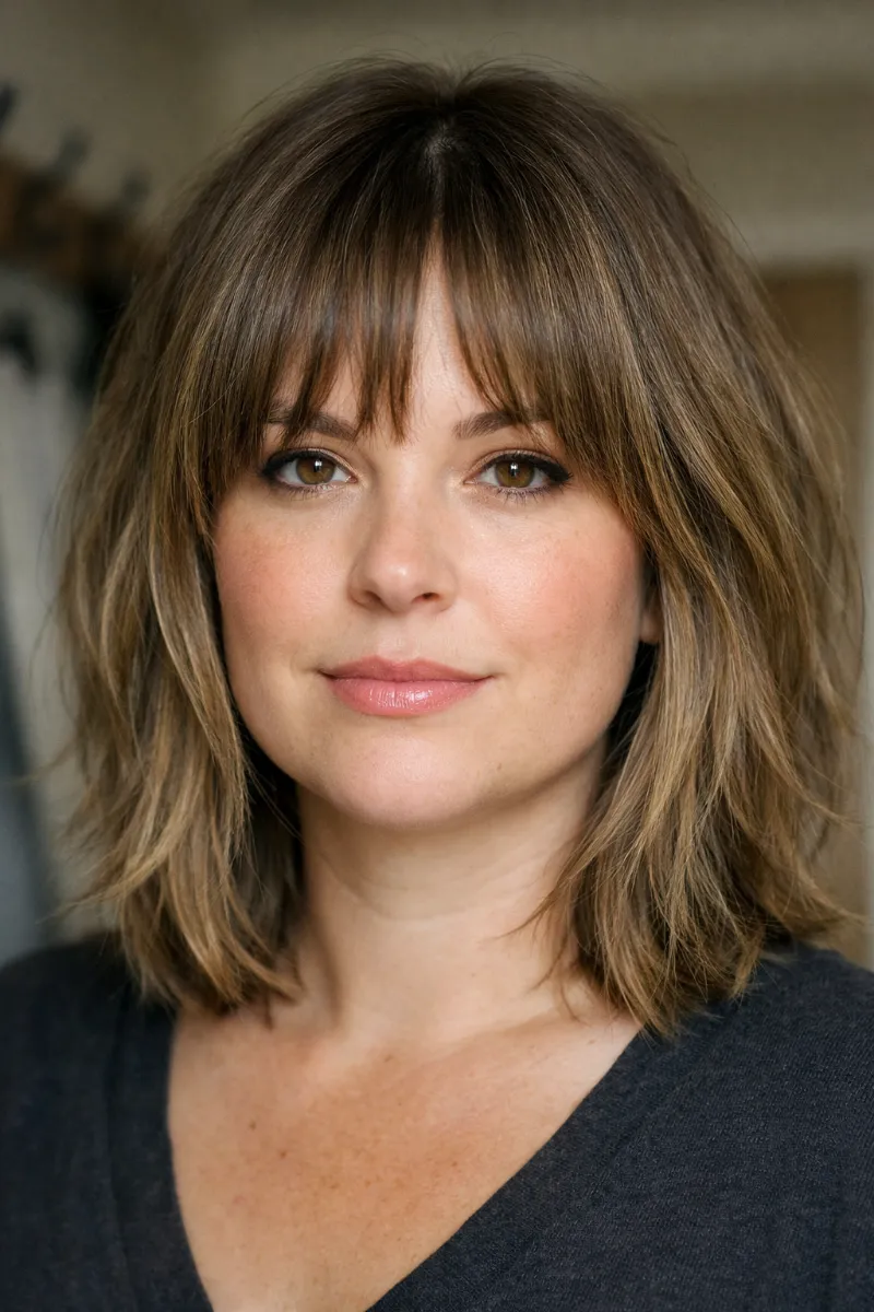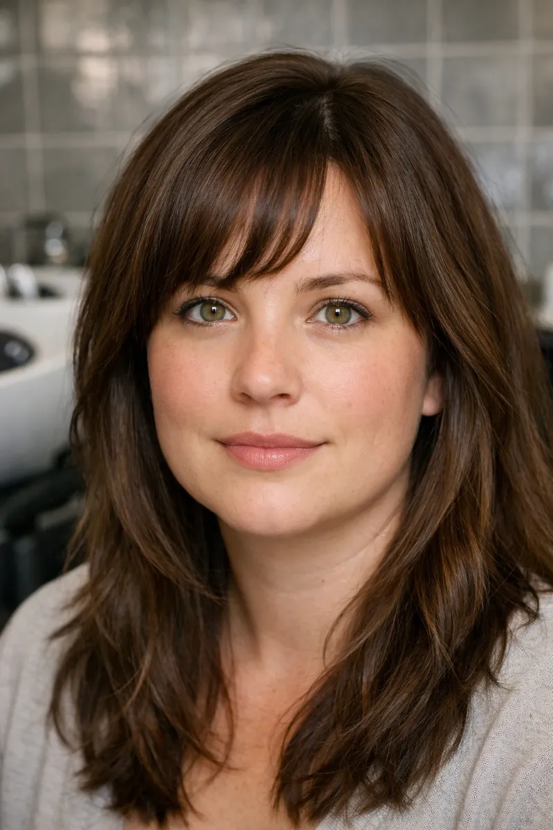 Ask for shoulder-length layers with feathered bangs that open softly and connect into the front sections. Keep the layers airy but not too chopped up. Blow-dry the bangs with a round brush and flip the ends lightly so the shape feels soft and full.
