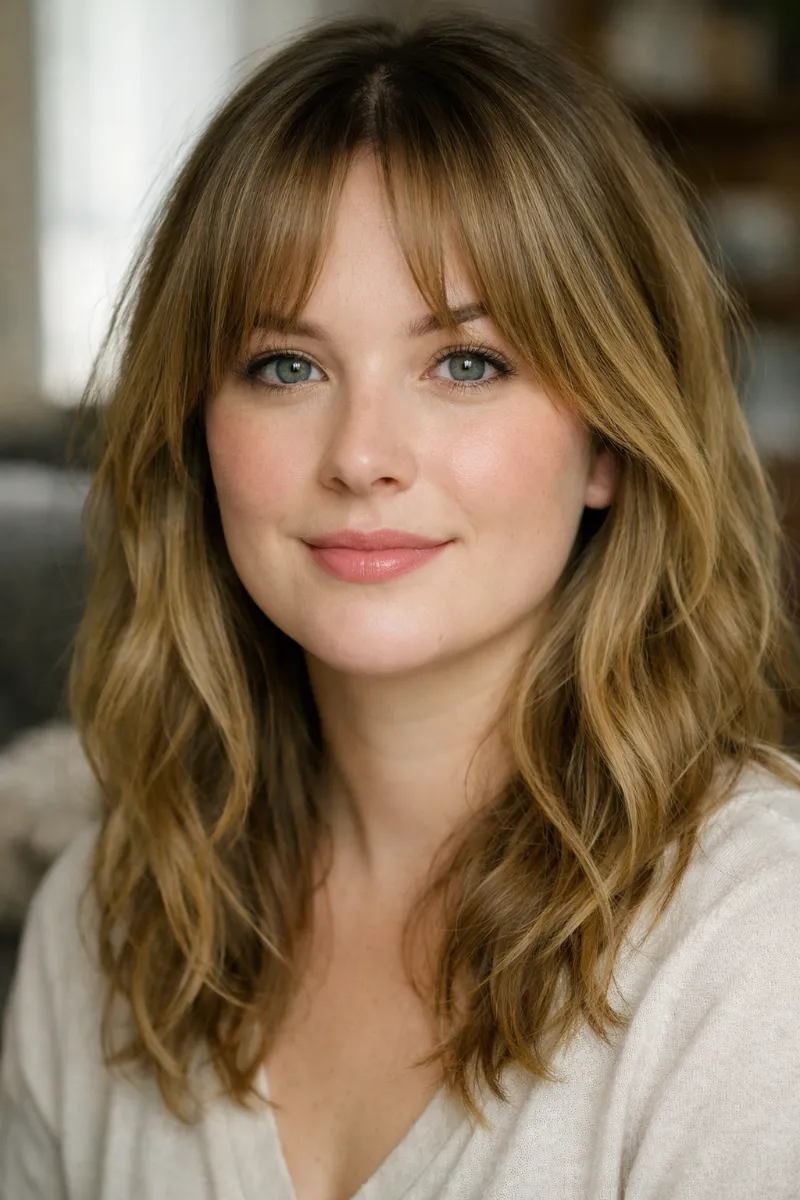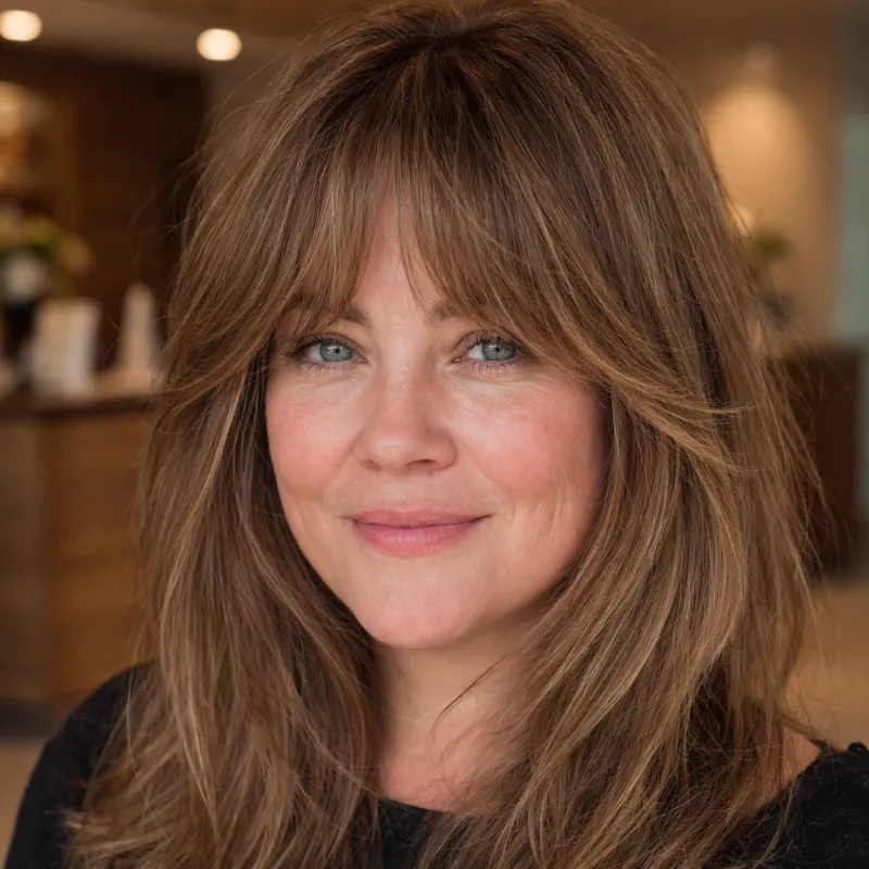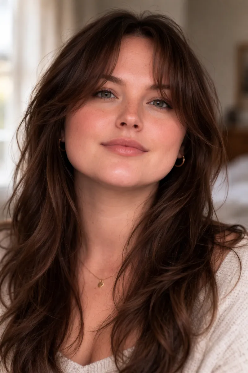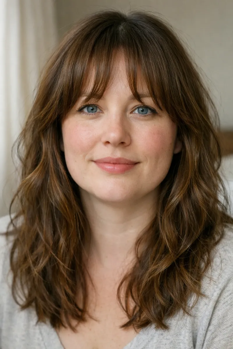 Ask for long layers with curtain bangs that split softly and extend into the cheek area. Keep the front light and blended, not chunky. Use a blow-dryer and medium round brush to turn the fringe out slightly so the face stays open.