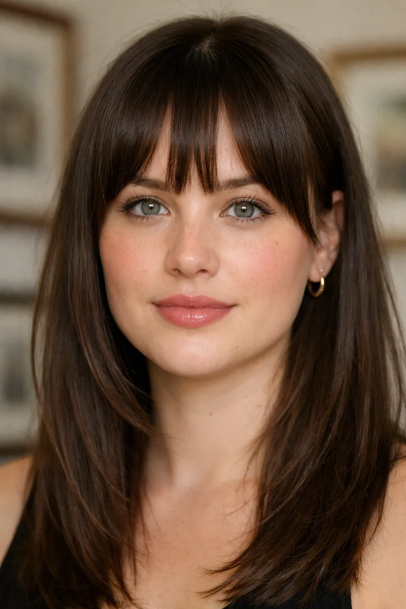 The side-swept bangs shift attention diagonally across the face, which can help a round shape look a little longer. The rest of the hair stays soft and simple, so the fringe does most of the work. This one feels easy, familiar, and very wearable.