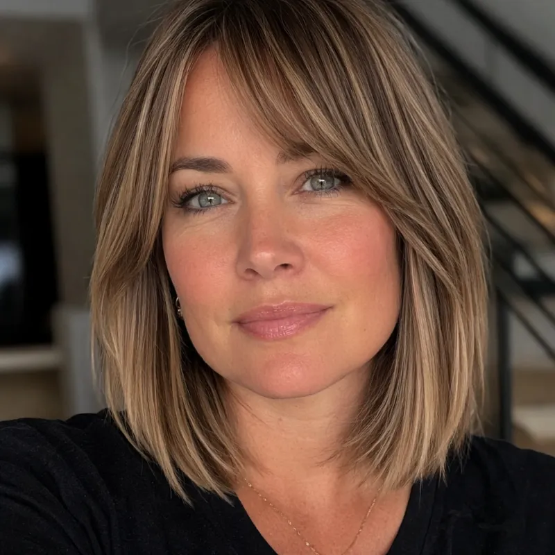 Ask for a textured lob with bottleneck bangs that stay shorter at the center and longer toward the sides. Keep the ends soft and lightly layered for movement. A round brush and light finishing cream can help the fringe sit neatly without losing softness.