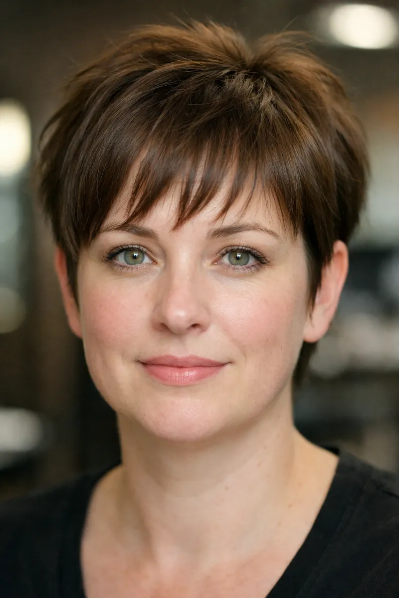 This bixie gives you the lightness of a short cut without looking too cropped or severe. The piecey bangs keep the forehead softer and add texture right where the style needs it. It works well if you want something short but still a little playful.