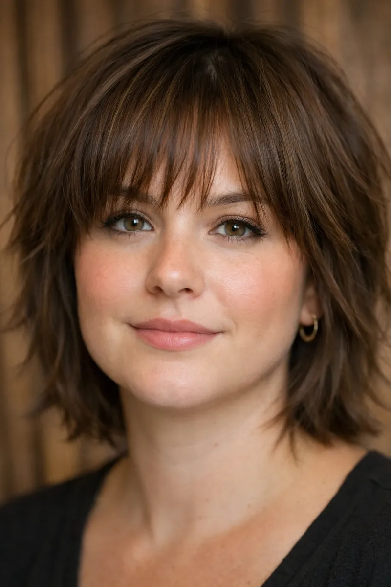 This shag has a lived-in shape that breaks up fullness in a flattering way. The choppy bangs keep the front light and a little undone, which suits the texture. It is a strong choice if you want something less polished and a bit more relaxed.