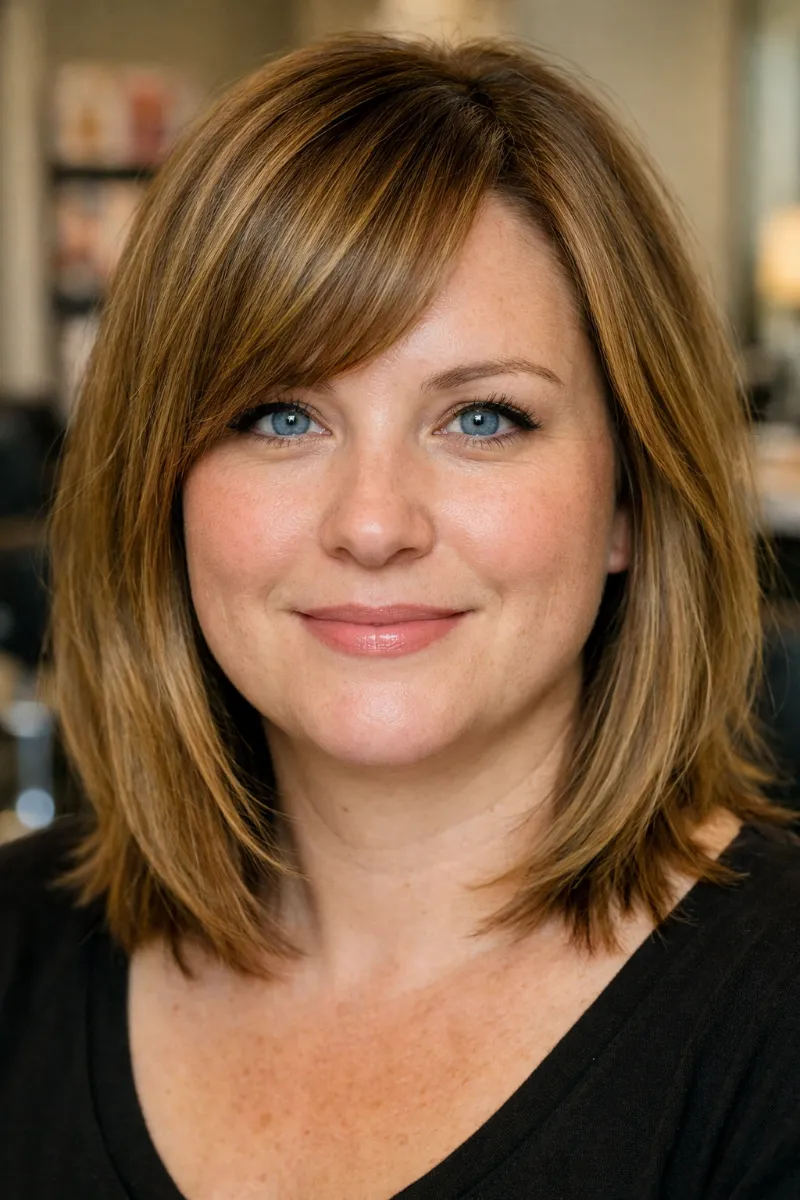 This shoulder-length cut has enough layering to keep the shape moving, but it still looks full through the ends. The feathered bangs soften the forehead and blend into the sides nicely. It is a practical style if you want movement without losing too much body.