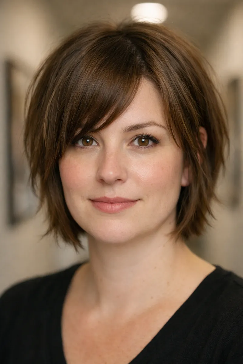 Ask for a textured bob with longer side bangs that sweep across and blend into the front. Keep the ends soft and slightly piecey rather than one solid line. A texturizing cream or spray can help the cut stay airy and a little undone.