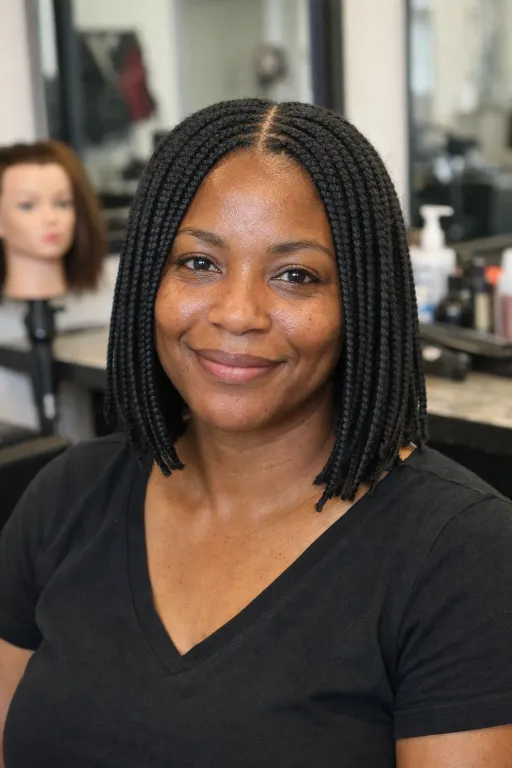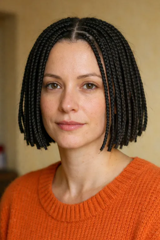 Ask for a straightforward braided bob with small even sections and a chin-length cut. Keep the finish soft around the hairline so the style looks natural up close.