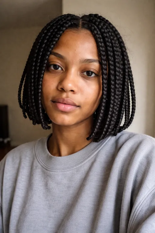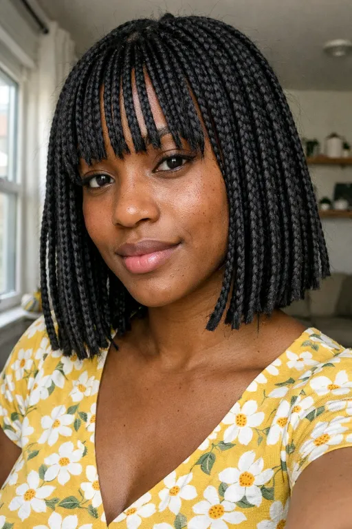Ask for small to medium box braids cut into a jaw-length bob with a crisp, even perimeter. Keep the part centered and the ends lightly sealed so the shape stays neat.