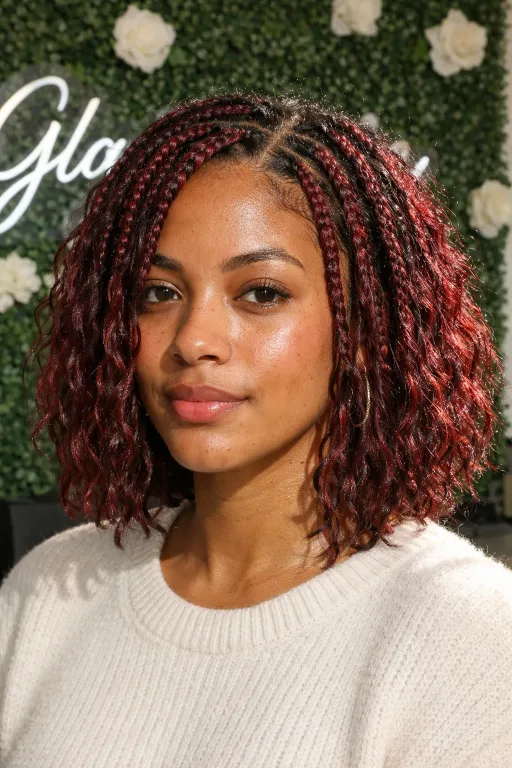 This bob mixes braid structure at the root with loose textured lengths, which gives it a softer finish than a standard braided bob. The burgundy tone also lifts the shape and helps the curls stand out more clearly in natural light.