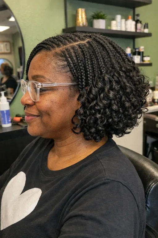 This style blends neat scalp braids into a rounded curly bob, which gives the sides more body without making the crown look bulky. The profile view shows how well the curls fill out the shape and soften the line near the jaw.