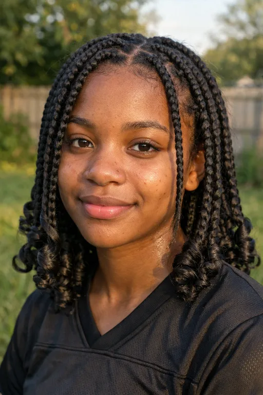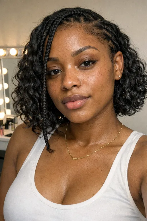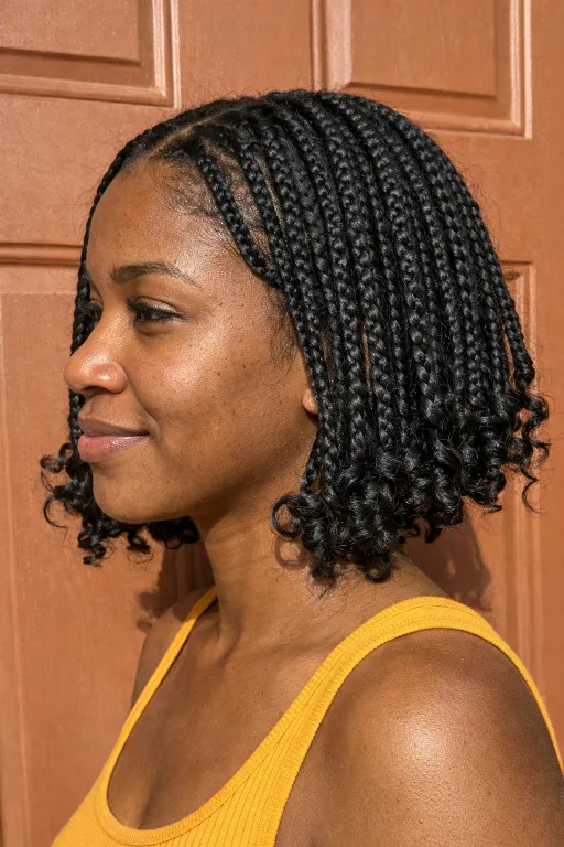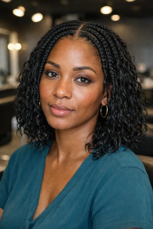 Ask for a knotless braid bob with loose curls from mid-length to ends. Keep the braids flatter at the root so the shape stays smooth through the crown.