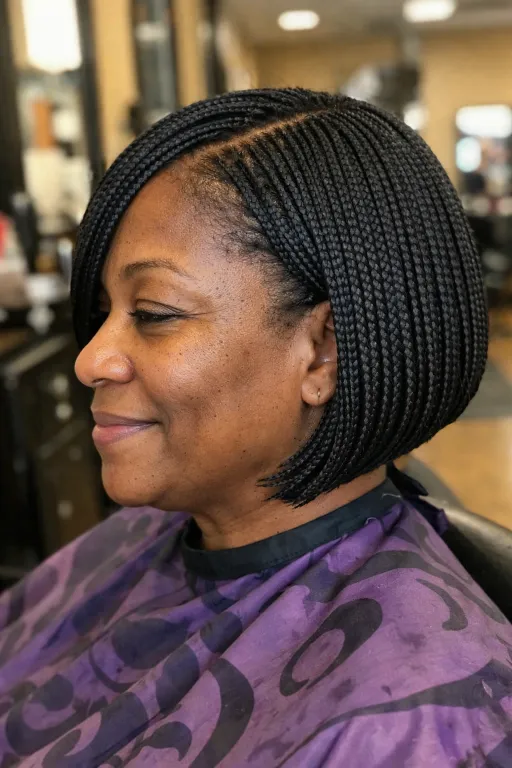 Ask for very small braids shaped into an angled bob with a deep side part. Keep the nape slightly shorter so the line curves in cleanly.