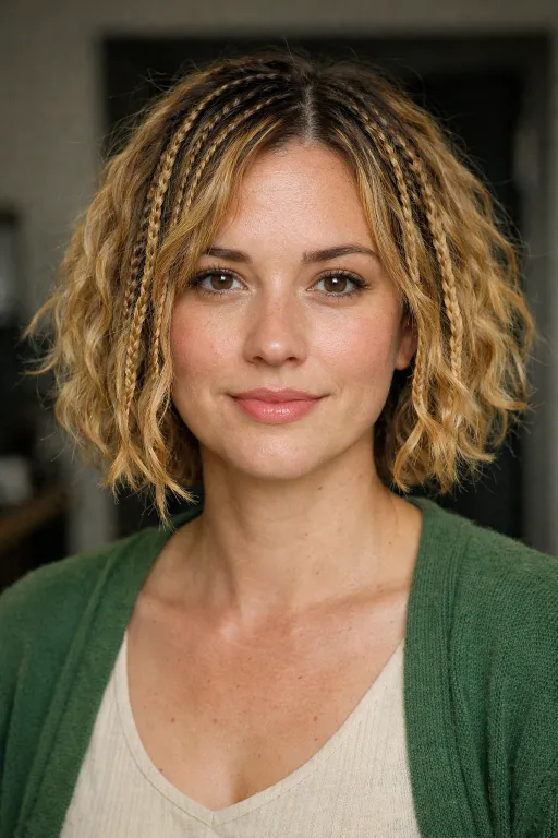Ask for braided roots with loose curls shaped into a rounded bob. Keep the back slightly stacked with more curl density so the silhouette stays full.