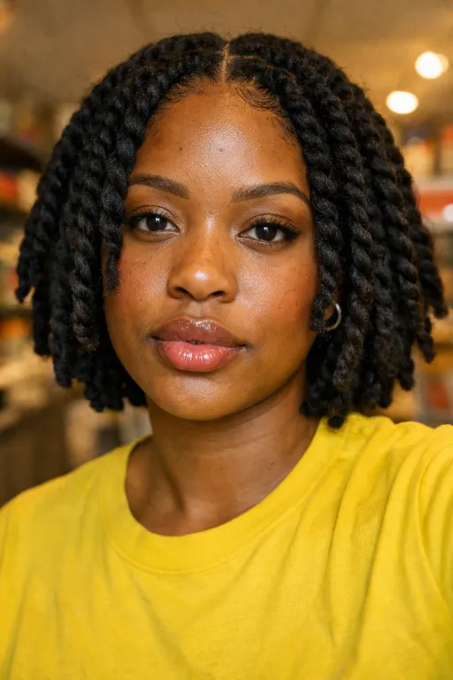 Ask for short rope twists cut into a bob that sits between the chin and shoulders. Keep the parts medium-sized so the twists stay full without crowding the scalp.