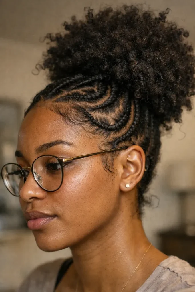 Ask your stylist for curved stitch braids that feed into a high puff, with clean parting and laid edges. Keep the puff full and soft so the style still feels easy and natural from every angle.