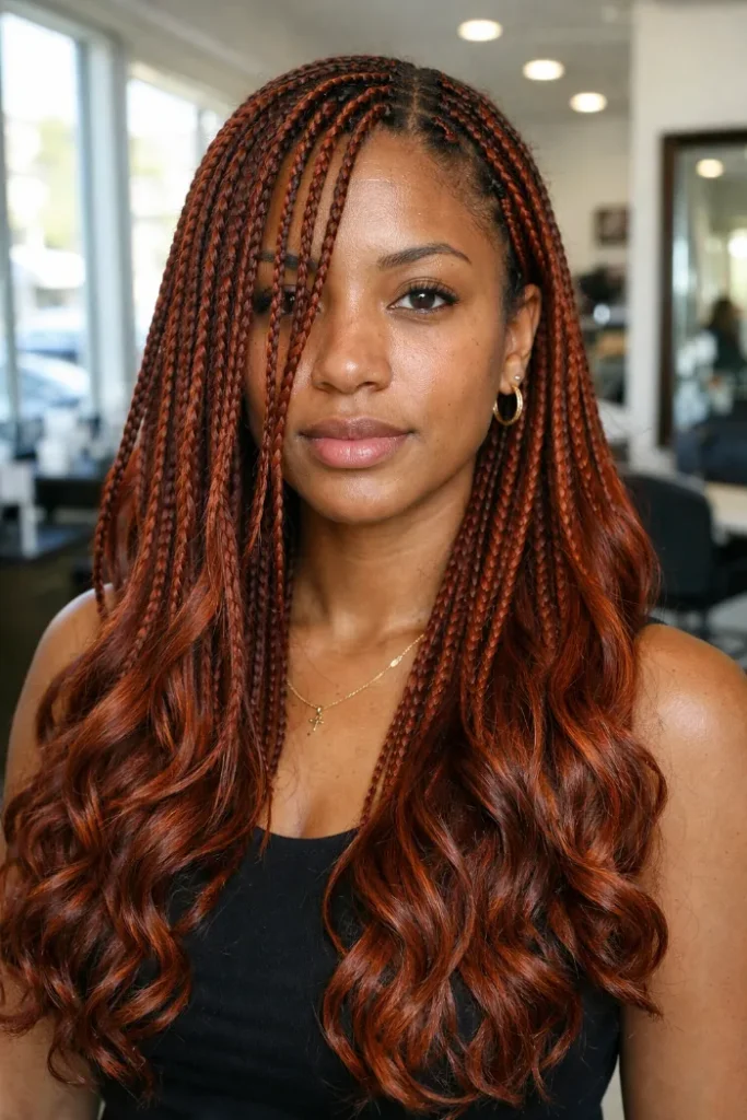 Ask your stylist for small, lightweight micro braids in a warm auburn shade with loose body-wave curls from mid-length down. Leave a few braids forward near the face so the finish feels softer and less strict.