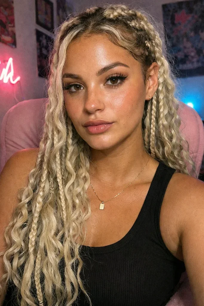 This honey blonde style feels bright and airy because the braid pattern is mixed with plenty of loose curly texture. The knotless base helps it sit flatter at the scalp, which keeps the longer lengths from feeling too heavy or dense.