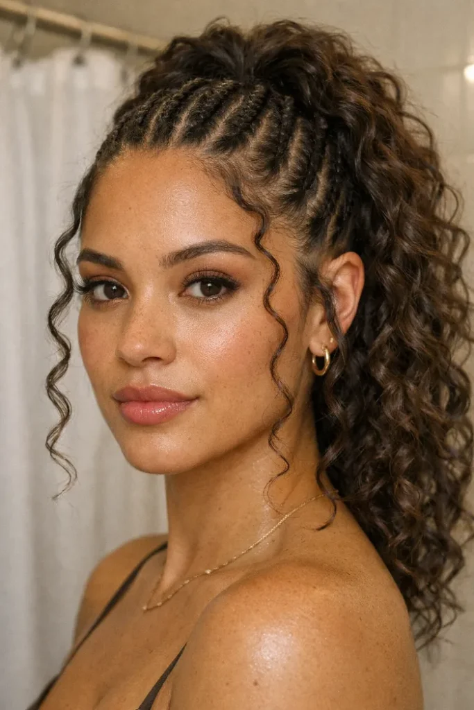 Ask your stylist for clean stitch braids into a high ponytail with long curly lengths at the back. Leave the curls defined and full, and keep the braid sections evenly spaced so the front stays balanced.