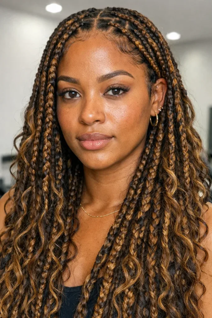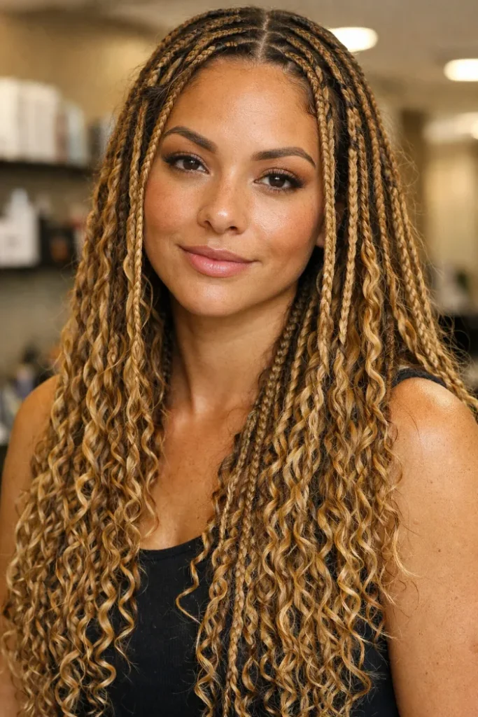 Ask your stylist for long knotless boho braids in a honey blonde blend with loose curly pieces throughout. Keep the root area neat and flat, then build most of the fullness through the mid-lengths and ends.