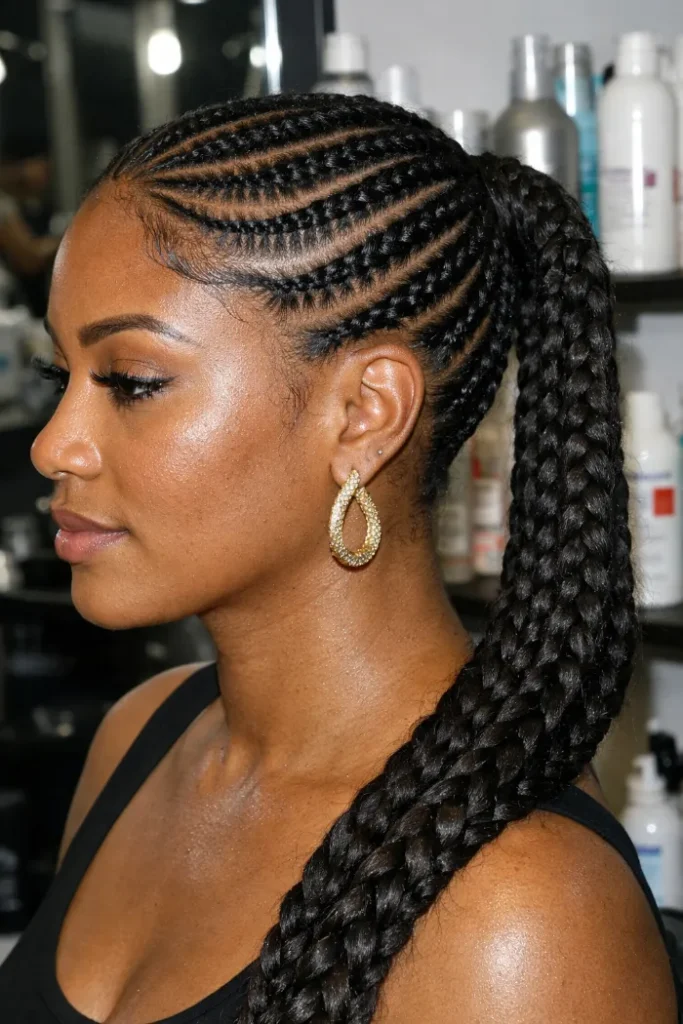 Ask your stylist for side-swept stitch braids gathered into one long braided ponytail. Keep the parting crisp, the feed-in work smooth, and the ponytail full enough to hold shape without feeling too heavy at the base.