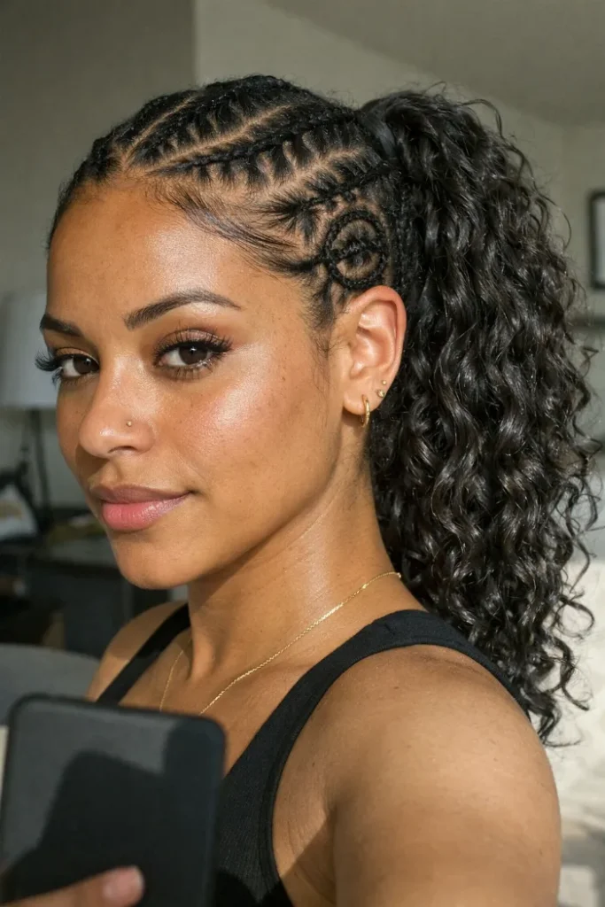 Ask your stylist for a tribal-inspired cornrow pattern with one swirl detail feeding into a high curly ponytail. Keep the scalp work sleek and the ponytail soft, with enough curl definition to contrast the braided top.