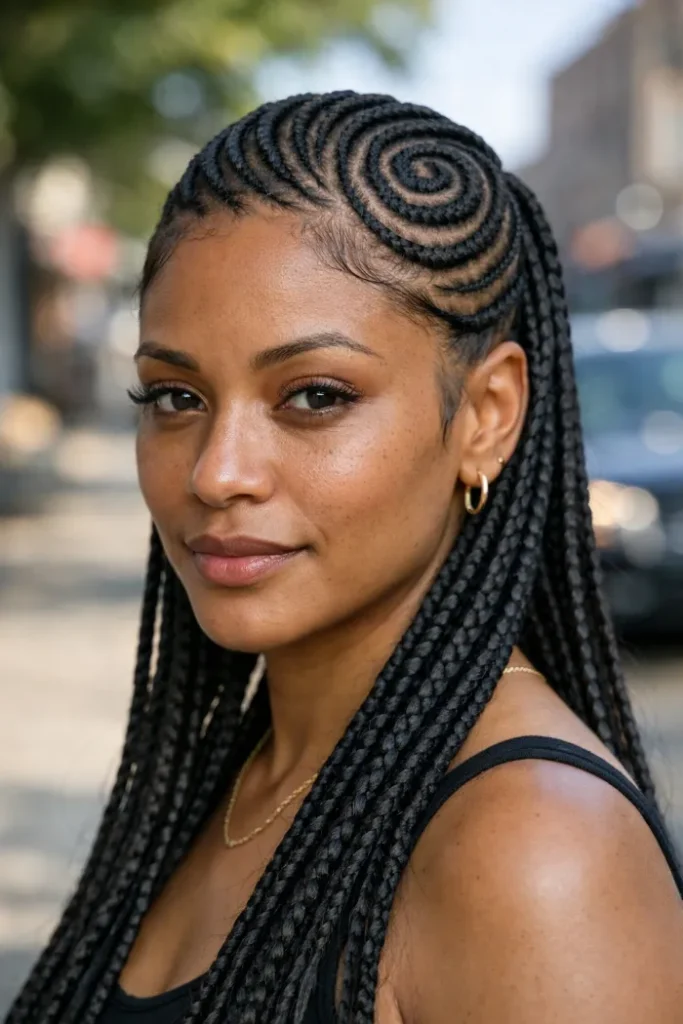 This look combines a striking swirl pattern at the crown with long braided lengths that fall past the shoulders. It feels more statement-making than plain straight-back braids, but still stays wearable because the design is focused in one area.