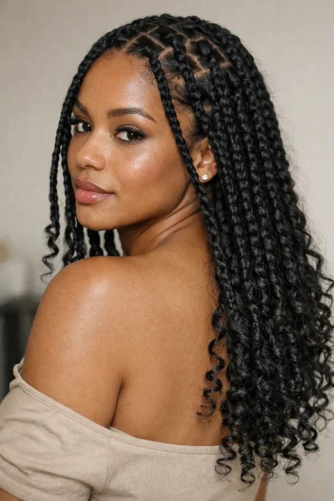 Boho braids, goddess braids, and braided ponytails with curls usually give that softer look. They still have the neatness of braids, but the loose texture keeps everything from feeling too sharp or too severe.
