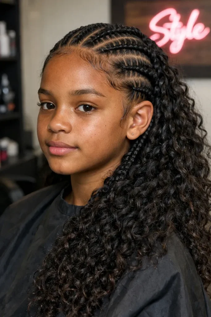 Yes, as long as the style is age-appropriate and not done too tightly. Half-up braided styles, curly braided ponytails, and simple cornrow patterns are often practical choices because they keep hair controlled while still looking cute and easy to manage.