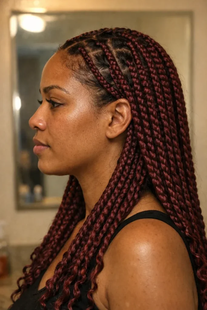 Ask your stylist for medium knotless box braids in a deep burgundy tone with smooth, even parting. Keep the braid size consistent and choose a lightweight finish so the color shows without the style looking bulky.