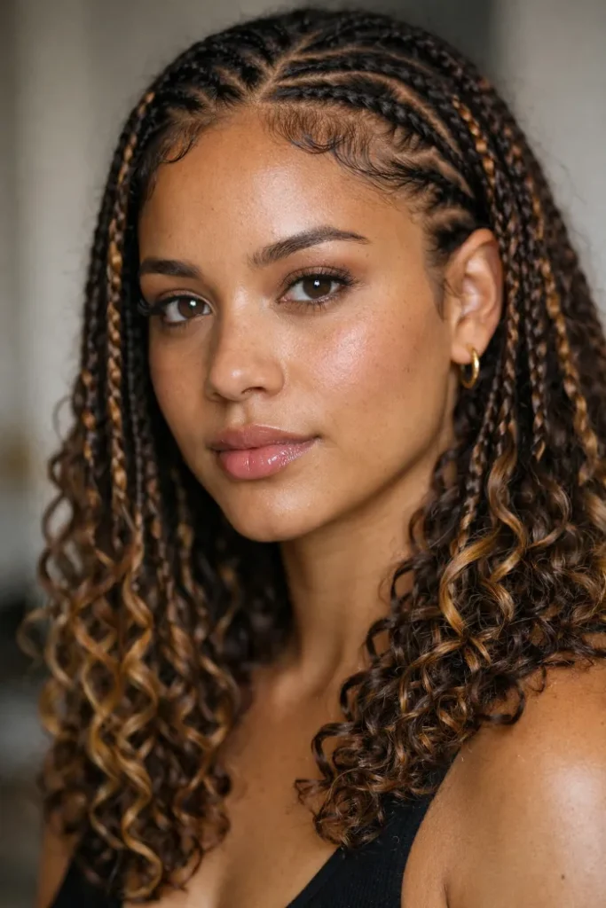Ask your stylist for fine micro braids with caramel highlights woven through and soft curled ends. Keep the braids small around the front for detail, and let the curls begin around chin level for a gentler finish.
