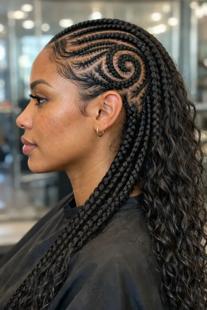 Ask your stylist for tribal cornrows with a defined swirl design on one side and longer braided lengths through the back. Make the pattern sharp and clean, but keep enough spacing so the design still reads clearly.