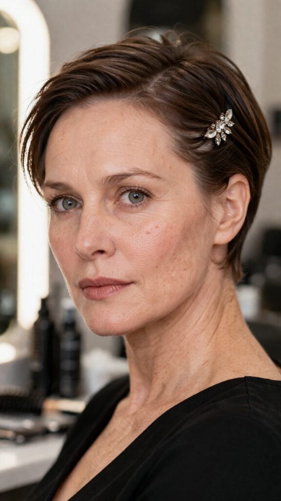 This short style is brushed back close to the head, but the deep side sweep keeps it from looking severe. The decorative clip gives it a clear evening feel, and the smooth shape works well when fine hair will not hold much volume.