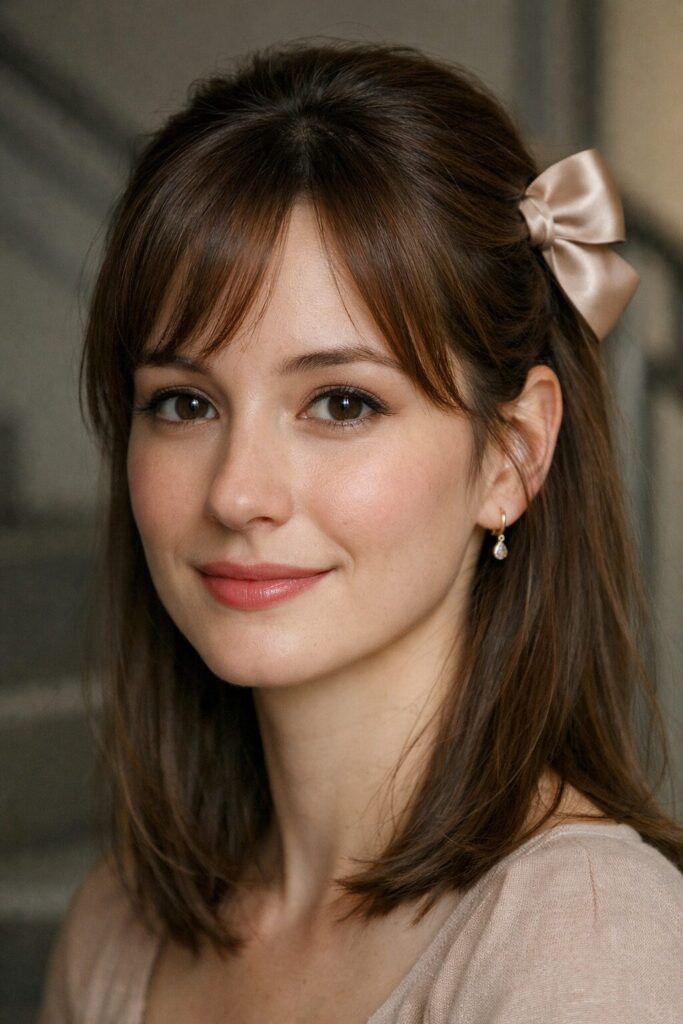 Ask for a soft half-up style with light tension at the crown and a satin bow clip placed at the back. Keep the ends smooth and lightly turned under.