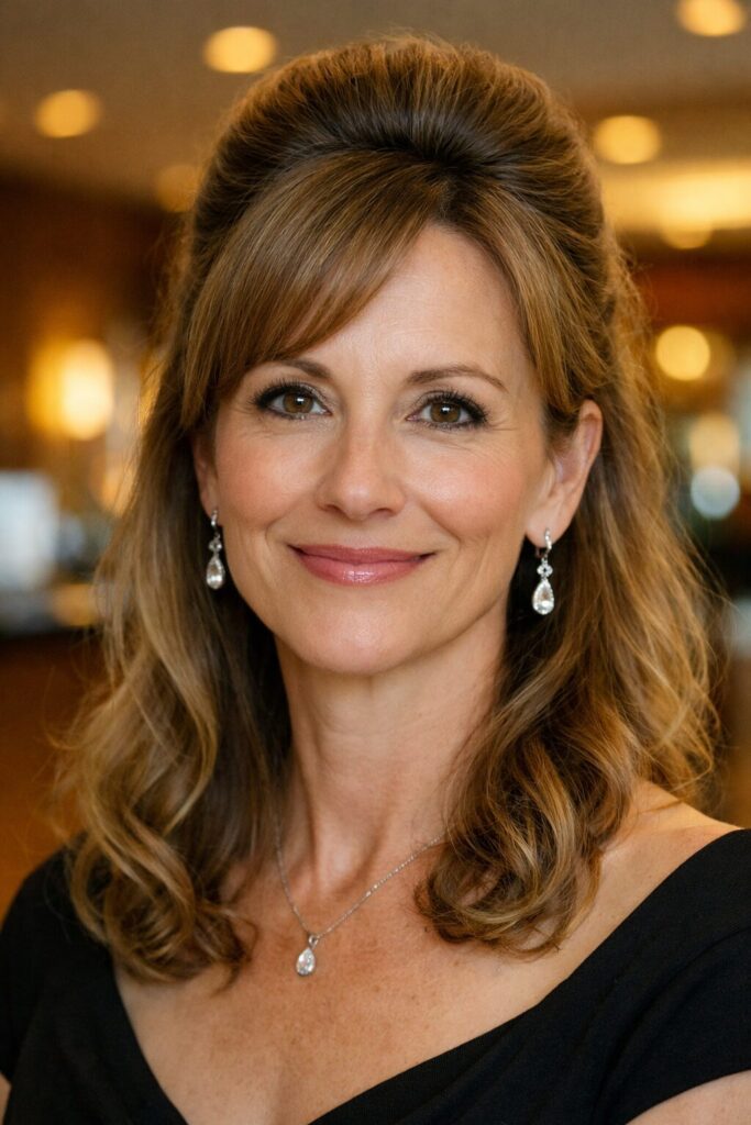 Ask for a half-up puff with gentle lift at the crown and soft bends through the ends. Use a light root spray so the top holds without getting crunchy.