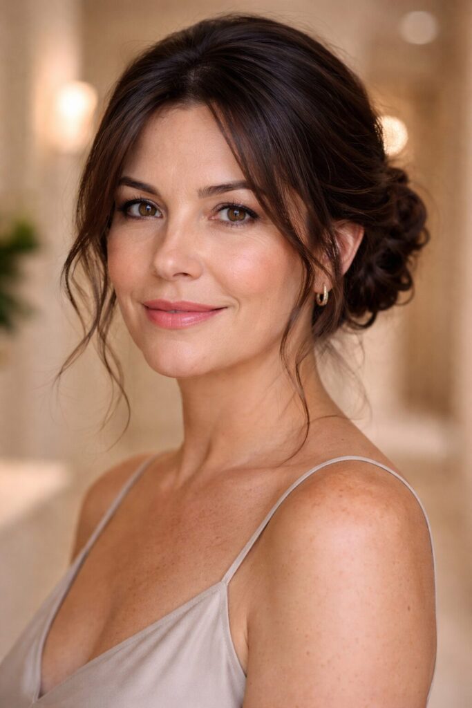 Ask for a loose side braid that feeds into a small low bun. Keep the braid slightly widened and finish with light hold spray so it stays soft, not stiff.