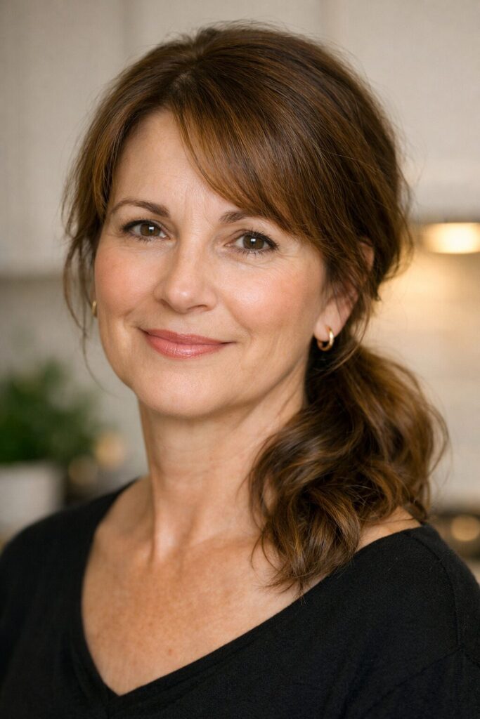 Ask for a low ponytail with gentle waves through the length and a little softness at the crown. A light curling iron pass through the tail helps it hold shape.