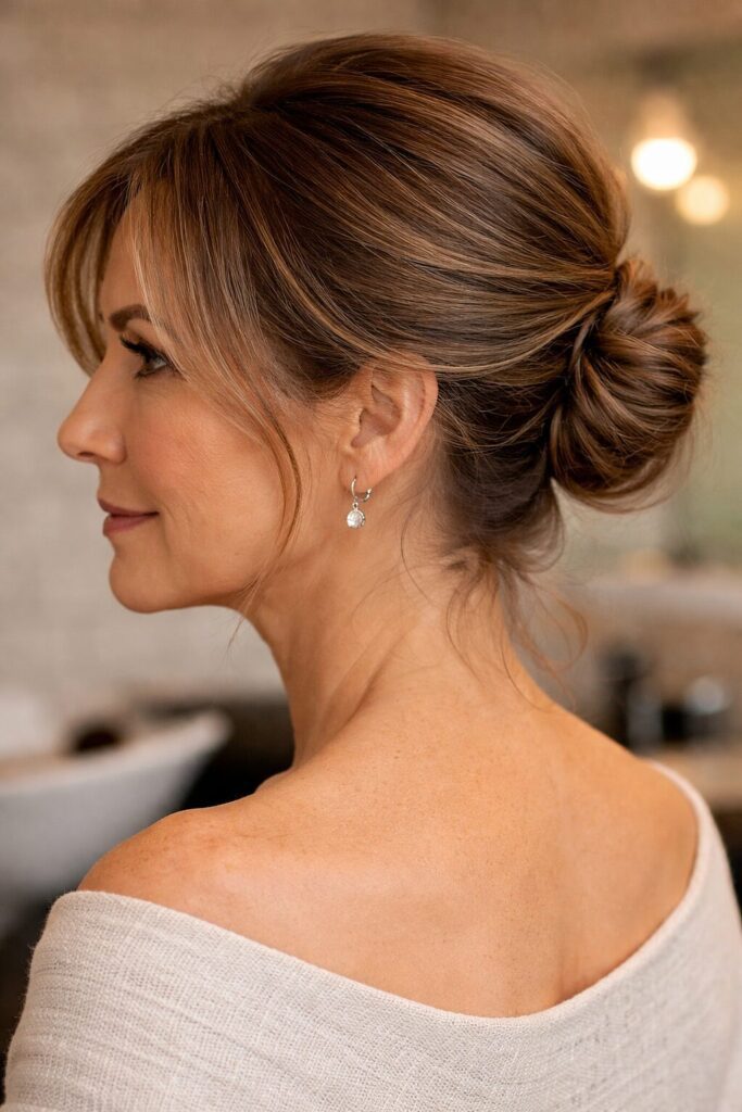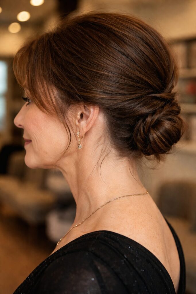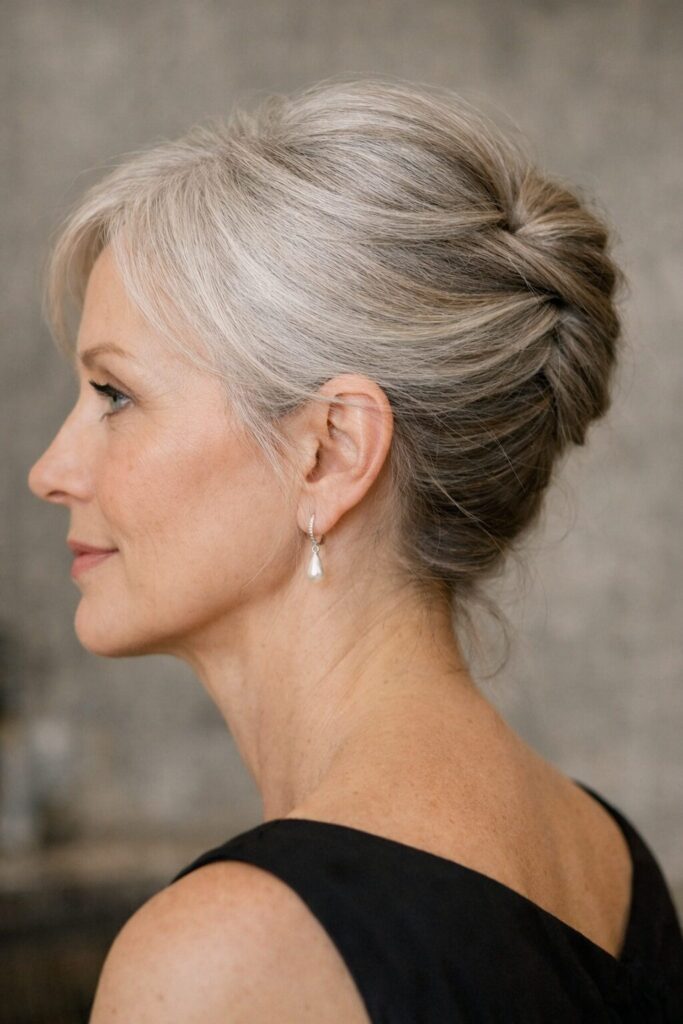 This silver updo keeps the crown smooth and the bun small, which suits fine hair well. The soft front section stops the style from feeling severe, and the clean shape makes it a nice choice for dinners, parties, or formal events.